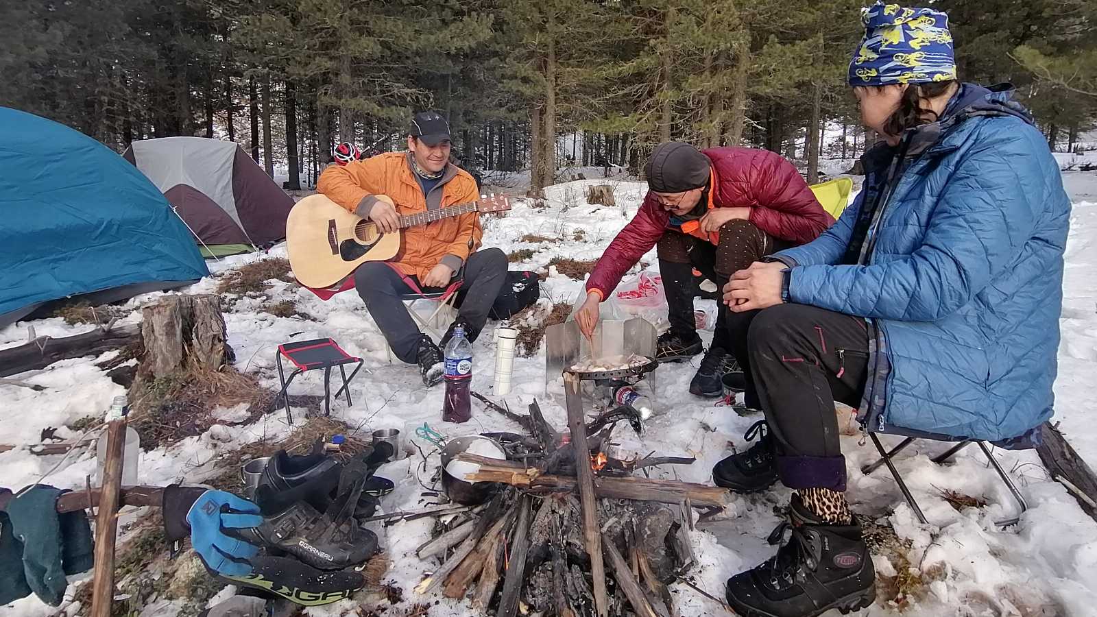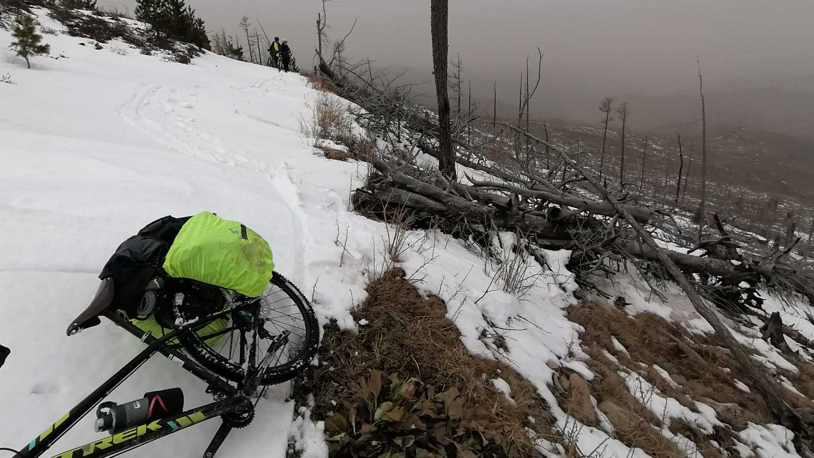 Уулын намхан хяр дээр гарч ирсэнээ, жаахан уруудаад бэл дагасан цастай замаар хэжин өгслөө. Цас овоо байна, нойтон бас 10-20 см зузаантай юм гээч. Нэг нь замаа хагалаад араас нь цуваа урагшилна. Гэнэт уруудчихлаа, энэ үед буруу замаар орсоноо мэдэв. Буцах аргагүй тул цас, чулуу туучин зүтгэсээр унасан мод бүхий нүцгэн энгэрт гарч ирэхүй, бид нэлээд доогуур явчихсан байлаа. Мурилзсан замаар өгслөө, тэр дээр ой мод харагдана, түүн рүү ороод отогльё гэж төлөвлөв. Зогсолтгүй махийсаар төлөвлөсөн газраа очлоо, нөгөө бидний ирэх ёстой байсан зөв зам дээрээ гарлаа, хувхайрч хатсан модны үлдэгдэл бүхий ой мод бараадан харьцангуй салхинаас нөмөр бага шиг цоорхойд цасан дээр отоглов.