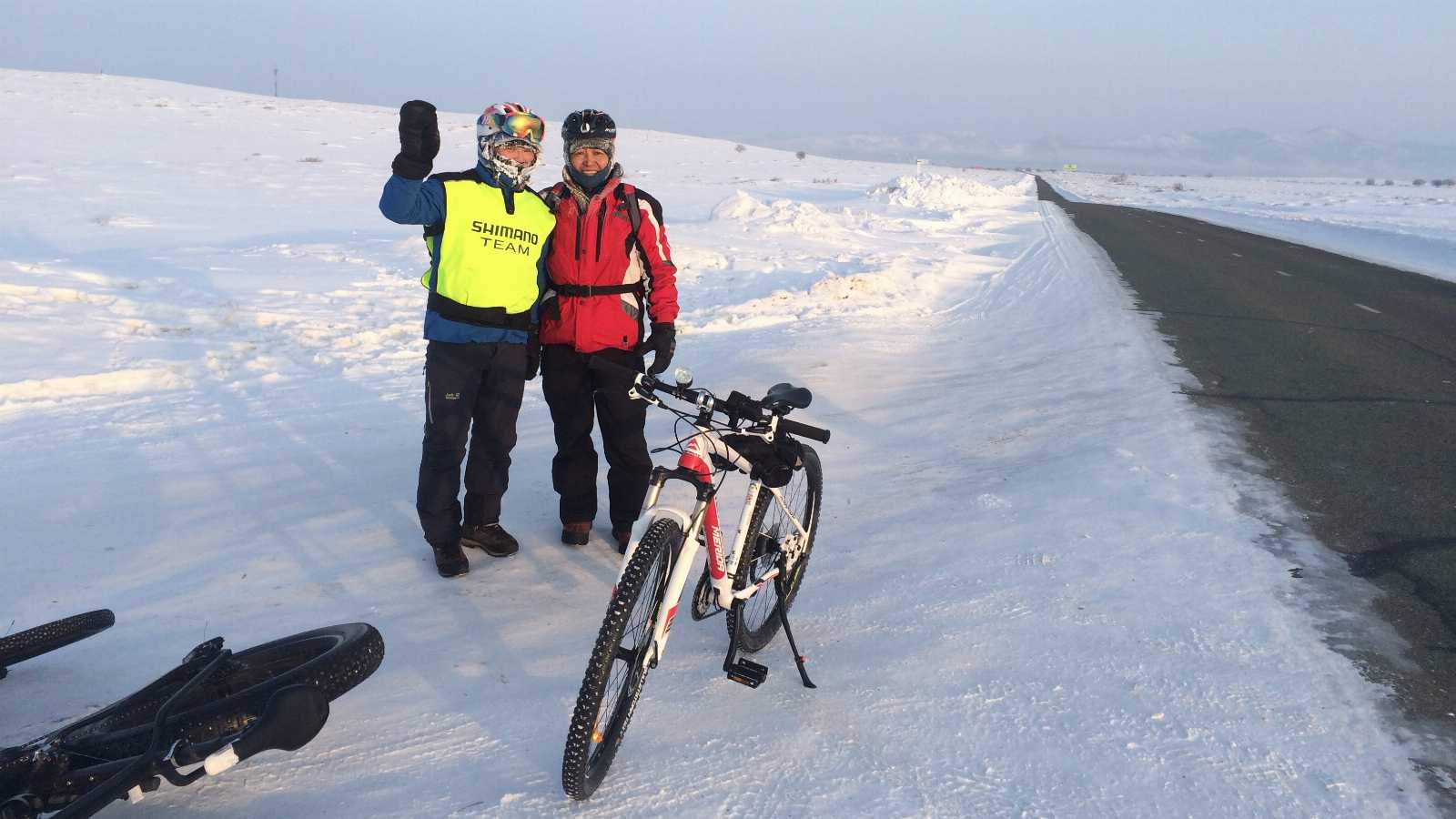 Зураг 2. Уулчин хоёр андын Сэлэнгэ аймаг дахь уулзалтНэг дугуйны маань арааны дотор талын тос хөлдөн хааяа хааяа сув сул эргэнэ. Энэ бол агаарын температур 30 хэмээс дээш хүйтэн байгааг сануулна. Ээж мод дээр очин сонирхож, дурсгалын зураг татуулан буцаад Сүхбаатар хот руу жийж ирэв. Ингээд өглөөний 22 км замд жийж, аяллын эхний төлөвлөгөө биеллээ.