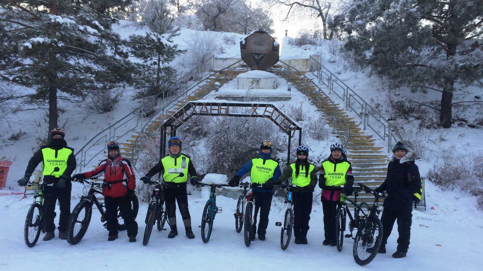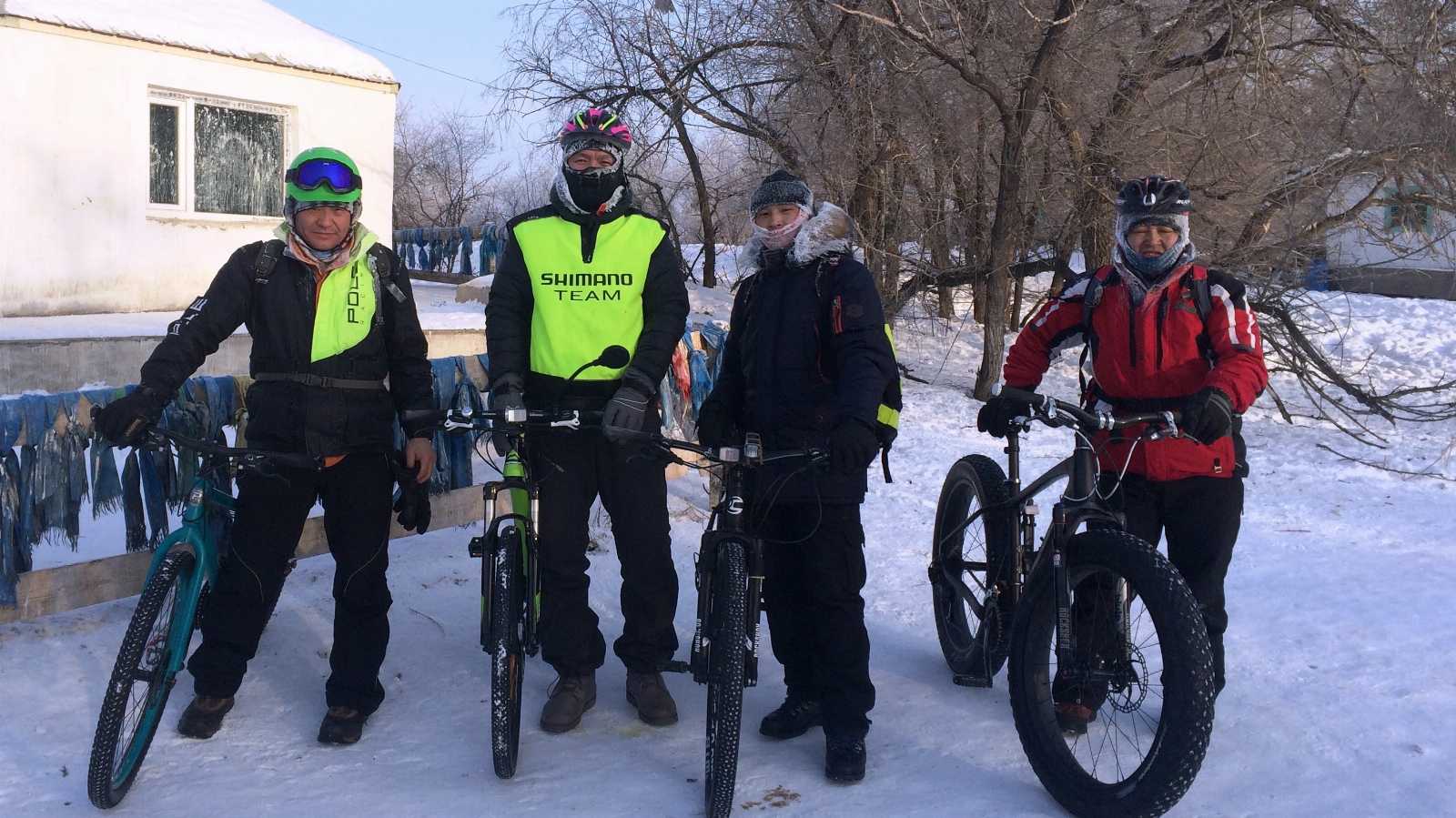 Зураг 4. Манай баг. Сайханы хөтөлЭнэ замд харин Сэлэнгэ нутгийн өвлийн жавар, хүйтнийг амссан даа. Ямар сайндаа өглөө үүрээр УБ хотод галт тэрэгнээс буухад хавар болчихсон мэт санагдах вэ дээ. Нутгийн дугуйчид харин ч гайгүй байна гээд огт анзаарах шинжгүй. Сэлэнгэ аймгийн Сүхбаатар хотод унадаг дугуй унадаг хүмүүс илт нэмэгдэж байгаа, нутгийн залуус клуб байгуулсан гэсэн нөхөрсөг яриагаар хачирлан оройн хоол хамтдаа идээд, дараа жилийн өвөл заавал ирнэ гэсэн дугуйчин хүний амлалтаа өгөн галт тэргэндээ суусан юм.
