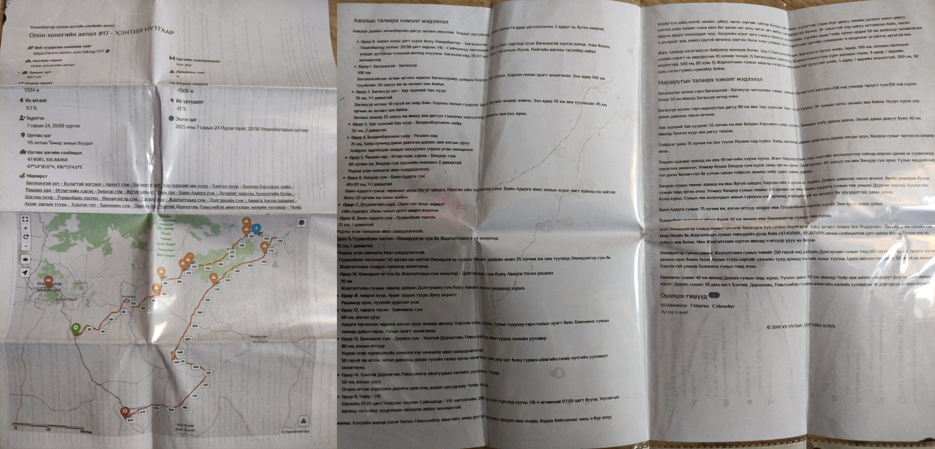 Ийнхүү аялал эхэллээ. Дараах зурагт веб дээр зарласан аяллын зар, маршрут, хөтөлбөр зэргийг хэвлэснийг харууллаа. Веб хөтөч дээр хэвлэх тушаал өгөхөд л шууд хэвлэхэд бэлэн болоод гараад ирдэг юм л даа. Энэ бол хэрэглэгч нь өөрөө хөгжүүлсэн системийн давуу тал. Үүнийг аяллын үед гар дор байлгахын тулд паск цүнх дотор багтахаар нугалж бас ус чийг болон үнгэгдэхээс сэргийлж пластик уутанд хийсэн. Зургийг нь аялал өндөрлөсний дараа авсан нь энэ.