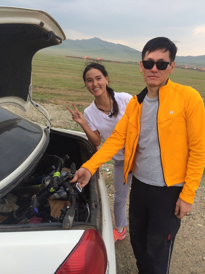 Зураг 9. Унадаг дугуй ачигдлаа. Одоо хот руу автомашинаар явна.Манай хоёр гишүүн намайг авахаар ийнхүү хотоос ирсэн нь энэ ажгуу. Ингээд бид 3 хамтдаа энэхүү судалгааны аяллыг амжилттай хийсэн билээ. Зүгээр л жий.