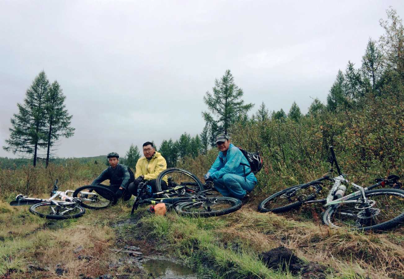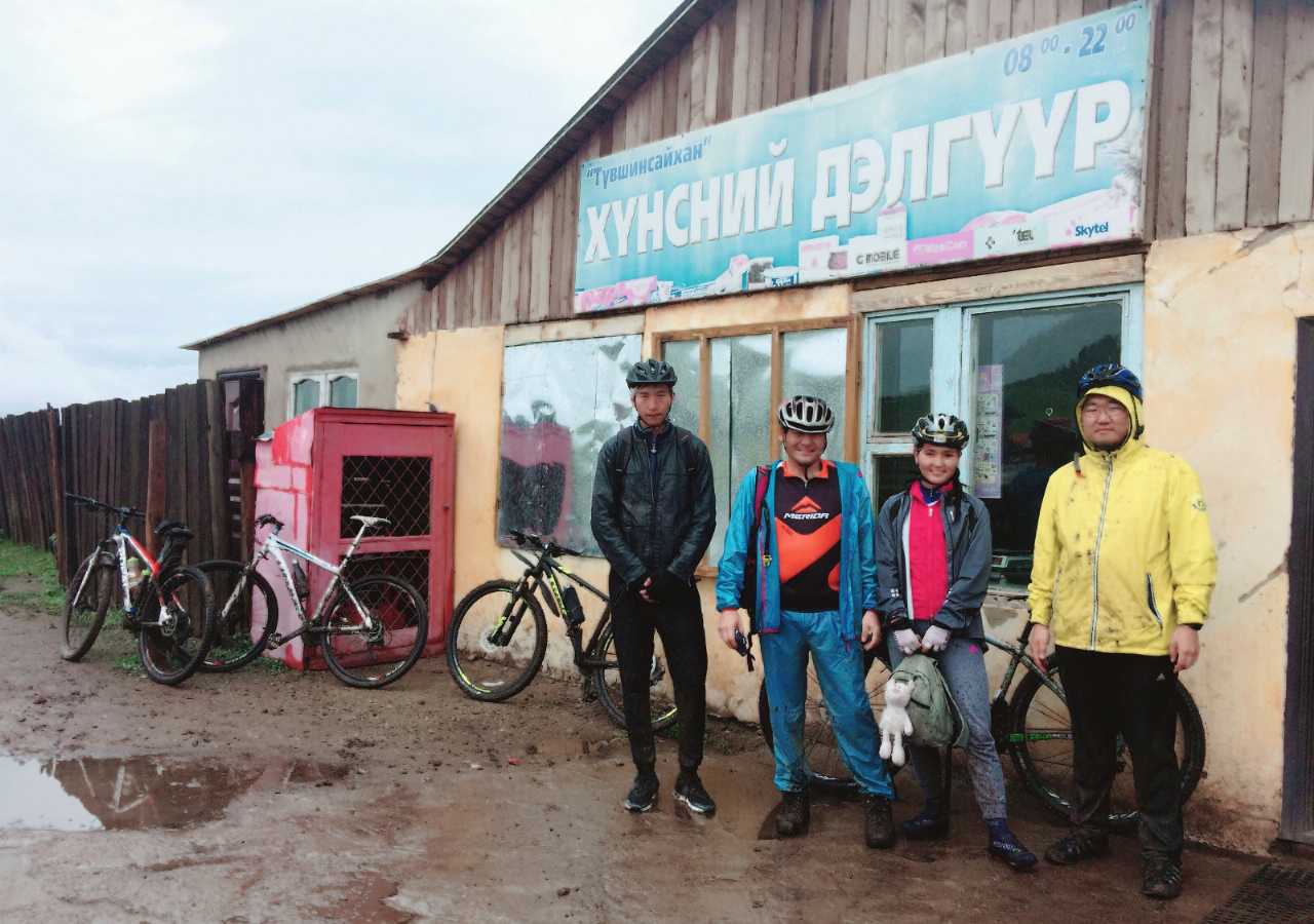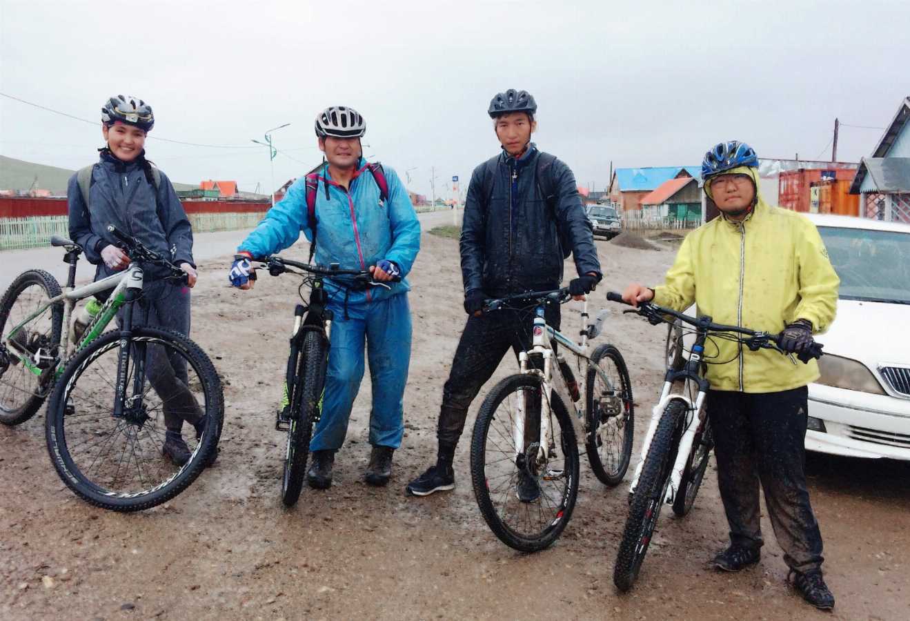 Зураг 2. Манай баг. Харгана орох замдЭнэ удаагийн аялалд "оролцсон" 4 дугуй бүгд 29'' хэмжээтэй тул дайруулаад л, саадыг харьцангуй хялбар давж байлаа. Үдлэг сууринд 11.00 цагт ирэв. Унадаг дугуйнууд шаварт дарагдан хүндэрч, хойд араа өөрийн дураар дээш доош солигдон гацаж, зарим дугуйны урд тоормосны накладка- ны завсар шавар орж ажиллагаагүй болгож, шажигнасан жижиг хэмхдэс чулуу дугуйны өнцөг булан бүрт шигжээ. Бид урагшилсаар 11.50 цагт Баянгол сууринд ирлээ. Баян гол дээр дугуйнуудаа угаалаа.