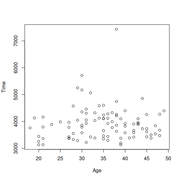 Тэмцээний дүн мэдээнээс зөвхөн эрэгтэйчүүдийн сонирхогч ангиллын тамирчдын 20-29, 30-39 болон 40-49 насыг л авсан. Өөрөөр хэлбэл seconds хувьсагч нь хүйс ба мэргэжлийн тамирчид зэрэг хүчин зүйлийн нөлөөнөөс ангид юм. Өөрөөр хэлбэл тус хувьсагч дээр зөвхөн насны нөлөө л байж болно.