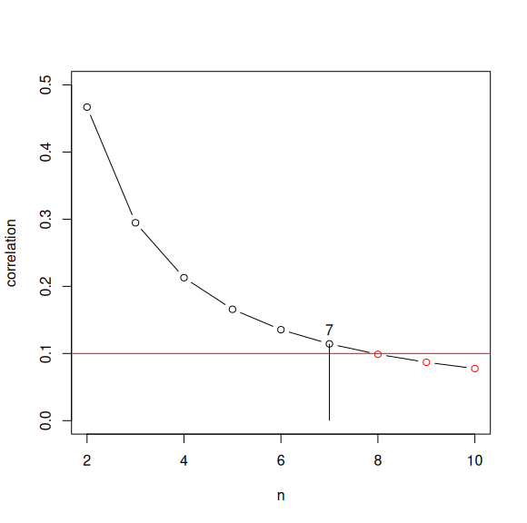 Цувааны минимал ба максимал элементүүдийн корреляц түүврийн хэмжээ өсөх тусам буурна. Гэхдээ хэзээ ч абсолют тэг утгад хүрэхгүй. Тэгэхээр түүврийн хэмжээ хэд болоход хоёр эрэмбийн статистикийг хамааралгүй гэж тооцож болох вэ гэсэн асуулт гарна. Энэ бол корреляцийн босго утгын тухай асуулт юм. Тухайлбал статистикт өргөн ашигладаг Коэны санал болгосон шатлал дахь "маш сул" хамааралтай харгалзах доод босго 0.1 байдаг. 0.1 утгыг сул хамаарлын доод босго гэж заасан өөр шатлалууд ч байдаг. Тэгэхээр корреляцийн утга 0.1 тооноос бага болох үед вариацын цувааны минимал ба максимал элементүүд статистик хамааралгүй гэж тооцно. Тэгвэл үүнд харгалзах түүврийн хэмжээ \(n=7\) гэж олдоно. Энэ бол групп аялалд оролцогдын тоо 8 байх үед цувааны толгойд яваа дугуйчны жийлтийн эрчим цувааны сүүлд яваа дугуйчинд нөлөөлөхгүй болно гэсэн үг юм.