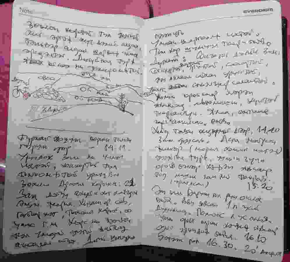 Даваан дээр гарчихлаа. УБ хот, Туул голын хөндий, Богд уул тэр чигээрээ алган дээр мэт харагдана. Энэ замаар оюутан ахуй цагтаа хэдэнтээ явж байгаад, Химийн ам гэдэгээр шууд Бурхант хошуу руу буудгийг мэдэж байсан. Тэр зүг замгүй учраас уулын орой, хяр дамжсан автомашины шороон замыг сонгон явлаа. Хэд хэдэн хяр руу өгсөж, багахан уруудаад дахиад л өгсөнө. Зүүн талаас хөндлөн зам ороод баруун тийш уруудаад явчихлаа. Зам дуусаагүй тул явсаар л байв. Унадаг дугуй жийх боломжгүй, олон жилийн хар модны шилмүүсэнд дарагдсан зам пампагнаад жийх боломжгүй шигдээд байсан. Тэгээд ч жийх тамир хүч сорогдсон мэт санагдаад, алхаад баймаар байлаа. Ер нь их тамирдсан, сүүлдээ хөлс урсахаа болив.