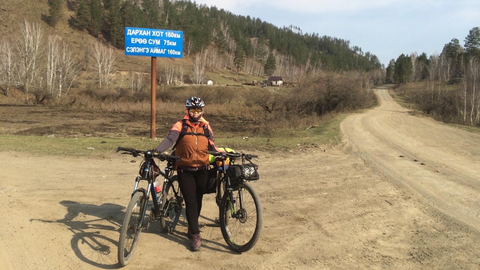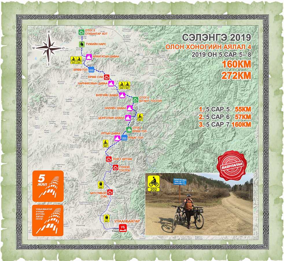 Тужийн нарсны хаяа руу өгсөх зам дээр Сэлэнгэ аймгийн дугуйчин хоёр залуу автомашинтай тосож ирэв. Та нартаа маш их баярлалаа. Араасаа хамгаалуулан баяр баясалтай, гэрэл гэгээтэй жийсээр 00.00 цагт СБ хотод ирж аялал маш амжилттай дуусав. Энэ өдөр бид хоёр 160 км (50% нь шороон зам) жийжээ.