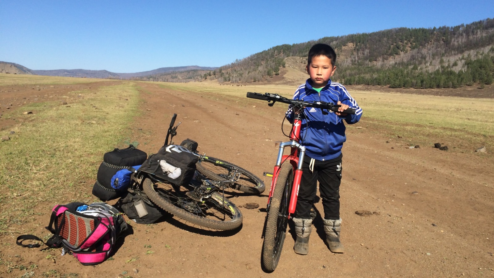 Зураг 3. Нутгийн хүү, аяллын замд тааравДугуй унасан 8 настай хөөрхөн хүүтэй таарч гинжийг нь тослож танилцав. Том болоод таньтай хамт аялалд явна гэж хэлээд үлдэв. Голын сав дундуур нөгөө зам маань өгссөөр үндсэн гол гарч төв замтай нийлэв. Уулын бараа ойртсоор ... дөхөөд ирлээ дээ. Эхний өгсүүрийг нь жийчихлээ. Одоо л огцом эхлэнэ дээ гэж бодсон чинь жийсээр байгаад Уртын даваа дээр гарчихлаа. Цаг 17.30. Давж үзээгүй даваа дээр ийнхүү "зөөлөн" жийсээр гарсан тул хирэндээ их баярлав.