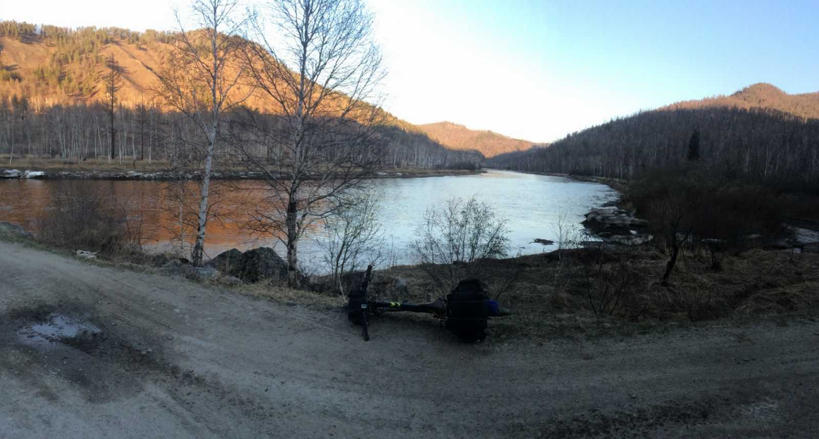 Зураг 5. Ерөө гол цэлэлзэн урсана. Ялбаг гол урд талаас нь цутганаЕрөө голд тулаад ирэв, Ялбаг голын цутгал нь улаан хүрэн устай тул Ерөө голын энэ хэсэг булингартана. Гол уруудан жийсээр яг л товлосон газраа 19.50 цагт ирж отоглож билээ. Шөнө хотод байгаа мэт алтны уурхайн техникүүд тасралтгүй дүнгэнэн "унтуулсангүй". Энэ өдөр 58 км жийсэн.