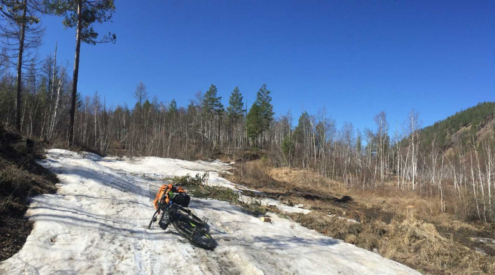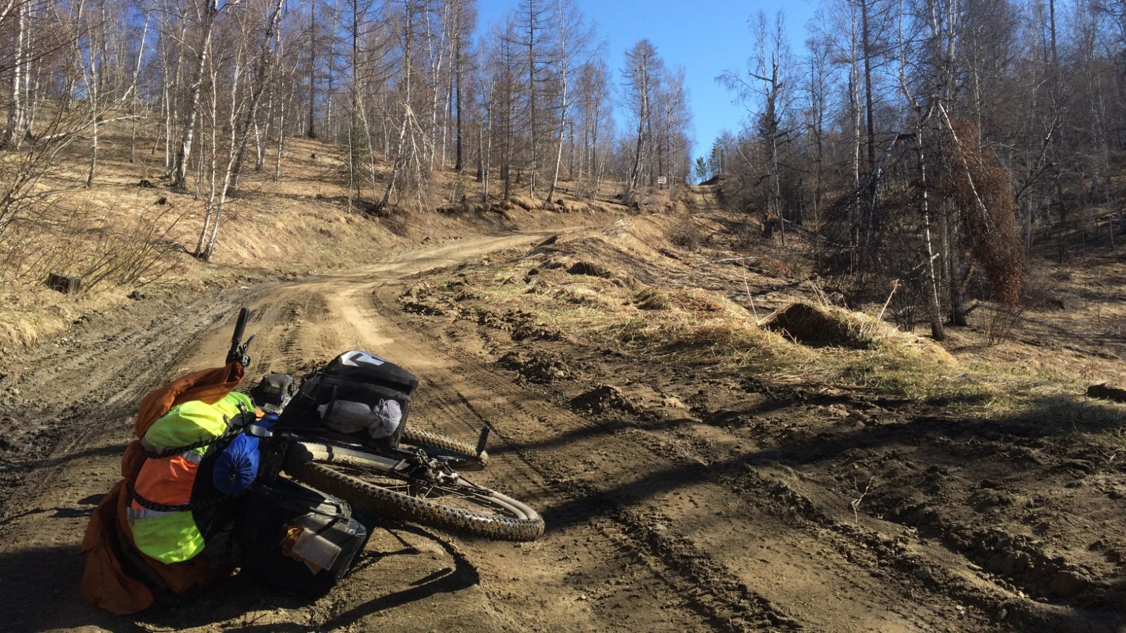 Зураг 7. Цонголын даваанаас уруудах замдУруудах зам нь харин ч нэг "тамын шоо" байв. Гүн ховил, шавар ус, мөс цас, халиа, шоржигнон урсах бохир горхи бүхий замаар зүдэргээтэй уруудана. Бага Ажирын гол бас л "бөмбөгдүүлжээ". Хээр голын голдирол, шавар ус, торлог дунд хаясан эзэнгүй трактор, эксковатор харагдана. Хүн айл амьтан алга. Зовлонтой урууг дуусган хөөрхий Ерөө голтойгоо ахин уулзав. Зам бүр ялбайгаад шавар дундуур туучлаа. Урд ацны завсар бөөн шавар хурж урд дугуй эргэхгүй болов. Гурван удаа цэвэрлэв. Дугуй хар яр дуугаран хамаг юм шавар болон урагшилна. Араа бол солигдож байсан.