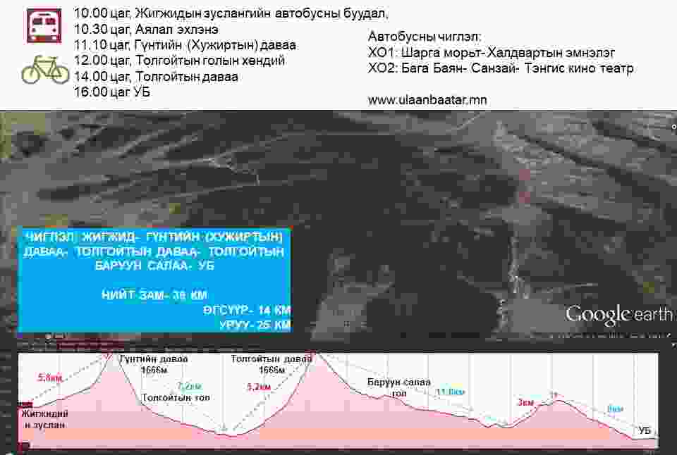 УБ хот орчмын байгалийн байдал, уулын тогтоц, зам харгуй, гол ус, даваа гүвээний ерөнхийлсөн ойлголттой тул төөрөхгүй аялаж чадах байх гэж өөртөө найдаж байсан. Намайг дагаад байгальд унадаг дугуйгаар аялах хүсэлтэй хүн байвал тэр л биз гэж бодлоо. Эхний аяллын гарааны (сүүлд цуглах цэг гэж нэрлэдэг болсон) цэг Жигжид зуслангийн уулзвар байв.