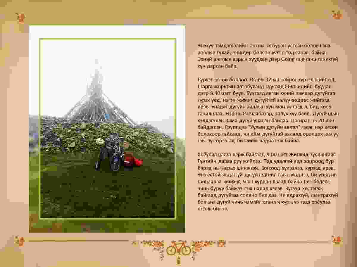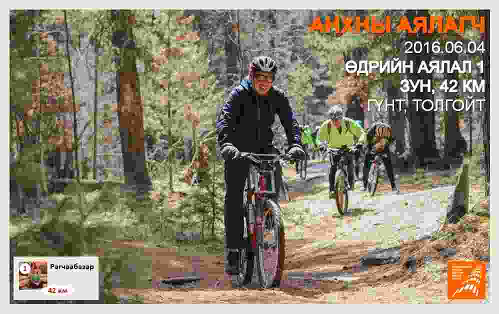Бүрхэг өглөө боллоо. Өглөө 32-ын тойрог хүртэл жийгээд, Шарга морьтын автобусанд суугаад Жигжидийн буудал дээр 8.40 цагт буув. Буугаад явган хүний замаар дугуйгаа түрэх үед, нэгэн жижиг дугуйтай залуу өөдөөс жийгээд ирэв. Унадаг дугуйн аяллын хүн мөн үү гээд л, бид хоёр танилцлаа. Нэр нь Рагчаабазар, залуу хүү байв. Дугуйчдын хэлдэгчлэн Кама дугуй унасан байлаа. Цагираг нь 20 инч байдагсан. Группдээ "Уулын дугуйн аялал" гэдэг нэр өгсөн болохоор гайхаад, чи ийм дугуйтай аялалд оролцох юм уу гэв. Зүгээрээ ах, би жийж чадна гэж байна. Хоёулаа цагаа харж байгаад 9.00 цагт Жигжид зуслангаас Гүнтийн даваа руу жийлээ. Төд удалгүй ард хоцроод бүр бараа нь тасрах шинжтэй. Зогсоод хүлээлээ, хүрээд ирэв. Энэ ёстой явдаггүй дугуй гэдгийг сая л мэдлээ, би урьд нь ганцаараа жийхэд маш хурдан яваад байна гэж бодсон чинь буруу байжээ гэж надад хэлэв. Зүгээр хө, тэгэж байгаад дугуйгаа солино биз дээ. Чи ядрахгүй, шантрахгүй бол энэ дугуй чинь чамайг хаана ч хүргэнэ гээд хоёулаа өгсөж билээ.
