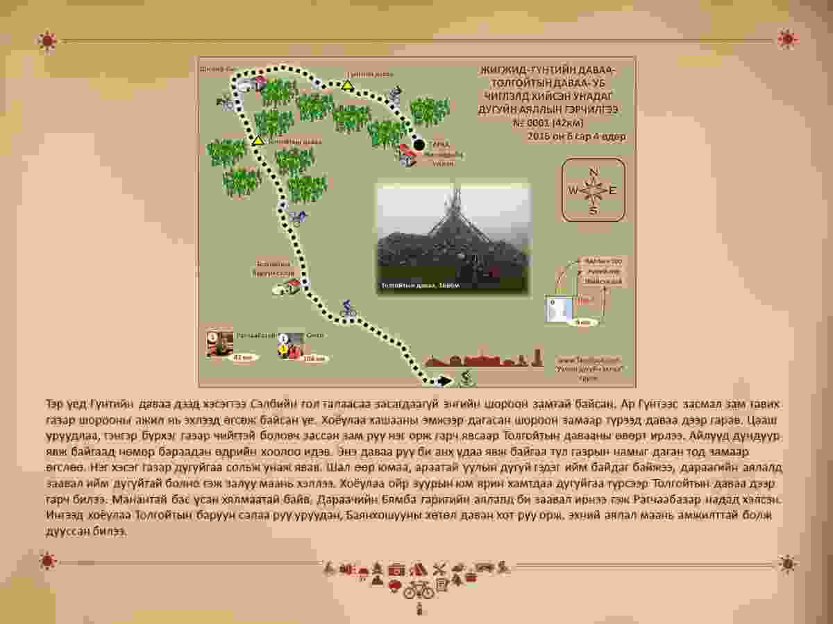Тэр үед Гүнтийн даваа дээд хэсэгтээ Сэлбийн гол талаасаа засагдаагүй энгийн шороон замтай байсан. Ар Гүнтээс засмал зам тавих газар шорооны ажил нь эхлээд өгсөж байсан үе. Хоёулаа хашааны эмжээр дагасан шороон замаар түрээд даваа дээр гарав. Цааш уруудлаа, тэнгэр бүрхэг газар чийгтэй боловч зассан зам руу нэг орж гарч явсаар Толгойтын давааны өвөрт ирлээ. Айлууд дундуур явж байгаад нөмөр бараадан өдрийн хоолоо идэв. Энэ даваа руу би анх удаа явж байгаа тул газрын намыг даган тод замаар өгслөө. Нэг хэсэг газар дугуйгаа сольж унаж явав. Шал өөр юмаа, араатай уулын дугуй гэдэг ийм байдаг байжээ, дараагийн аялалд заавал ийм дугуйтай болно гэж залуу маань хэллээ. Хоёулаа ойр зуурын юм ярин хамтдаа дугуйгаа түрсээр Толгойтын даваа дээр гарч билээ. Манантай бас усан хялмаатай байв. Дараачийн Бямба гаригийн аялалд би заавал ирнээ гэж Рагчаабазар надад хэлсэн. Ингээд хоёулаа Толгойтын баруун салаа руу уруудан, Баянхошууны хөтөл даван хот руу орж, эхний аялал маань амжилттай болж дууссан билээ.