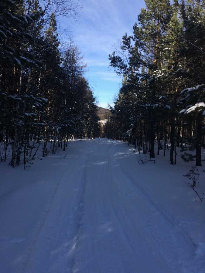 Автомашины мөр тод, харьцангуй дагтаршсан цастай, ер нь энэ замаар автомашин явдаг бололтой. Унадаг дугуйгаар жийх боломжтой харагдав.