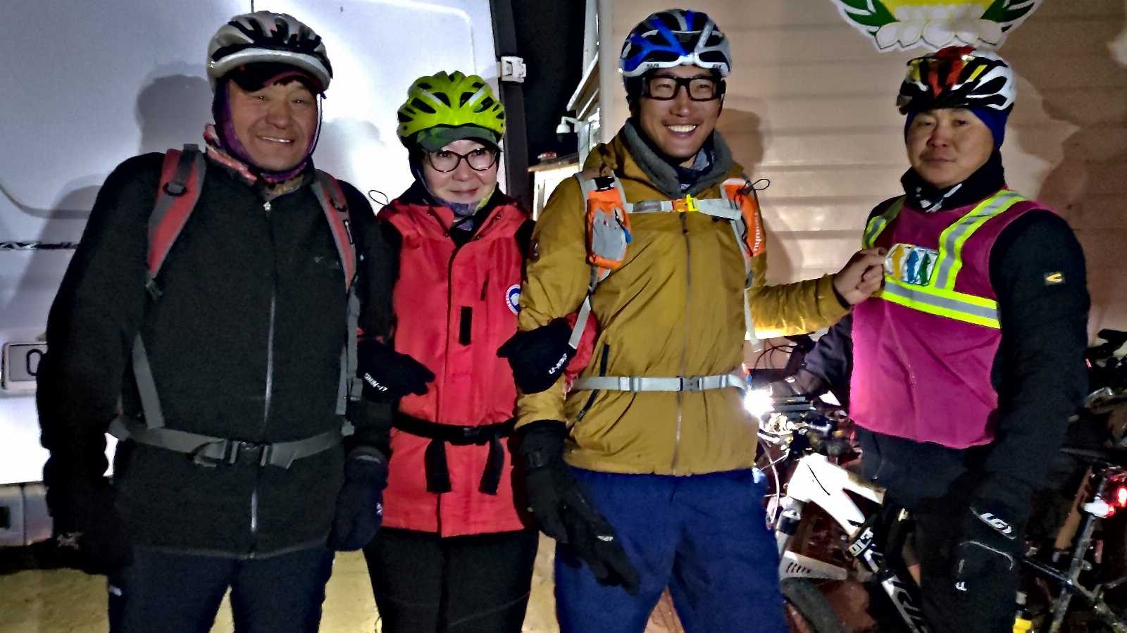 Ингээд салхины өөдөөс багийн ажиллагааг утгаар нь үзүүлж дугуйчдынхаа салхинд суусаар арайхийн нэг юм Батсүмбэрийн замд ирж аяллын чиглэл урагшаа эргэхэд салхи араас болж шууд манай талын салхи мэт санагдаж пөн хийсэн дулаан биднийг нөмөрч авлаа. За дараагийн таталт 3-61 гарам гэж админ хэлээд хөдлөв. Араас түлхэх салхинд засмалаар уруудан жийх нэн таатай. Замын өгсүүр уруу хэд хэд тохиолдоход багаасаа багахан хоцроод эргээд нийлнэ. Хэдийгээр бөөндөө явж байгаа ч эрчүүдийн тасралтгүй үргэлжлэх өндөр тэмп намайг өөрийн эрхгүй цуцааж байсан ч хамгийн их цуцаалт нь харанхуй шөнийн баригдмал байдал, хөдөлгөөн хорих зузаан өмд байлаа. Цас орсон ч үгүй, тэгтлээ хүйтэн биш шөнө давхарласан хувцас зузаадаад ч байх шиг, шөнийн сэрүүнд таараад ч байх шиг. Бидний гэрэл нэгдээд учир нь олдохгүй олон жижиг гэрэл болж жолооч нарт ойлгомжгүй байгаа бололтой. Зарим машин зогсож өнгөрөөнө. Ухаалаг жолооч нар холын гэрлээ шилжүүлэхэд нь үнэхээр баярлаж үл шилжүүлж нүд гялбуулан тэнцвэр алдуулах шахам хурдтай өнгөрөх нэгэнд бас л гомдмоор.