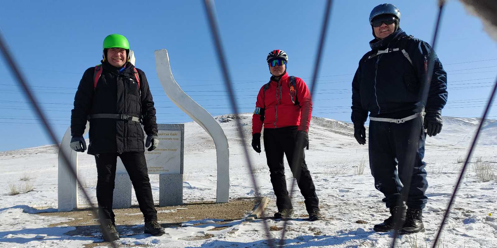 Зураг 1. Манай баг аяллын оргил цэг буюу Сонгино хайрханы баруун хойд өвөрт, 13:03Уужимхан өгсүүрт урамтайхан жийж гараад даваа уруудан хүйтэн салхинд хөл яльгүй даараад ирэхэд, Сонгино суурингийн автобусны буудал дээр Админ маань татаад хүлээж байв. Цааш засмал замаар бөөндөө хоёр эгнээ болон хамтдаа жийсээр Туулын гүүр рүү баруун тийш салав. Энд замаас урагш гарч эртний түүхэн сурвалжаар Хэрэйд аймгийн Ван Тоорил ханы Туулын хар түнэл гэж нэрлэгдэх ордоны туурийг үзэж сонирхов. Энэ туурин дээр одоогоос 800 орчим жилийн тэртээ Тэмүүжин хар булган дахаа барьчихаад явж байсан даа гэж бид хөөрөлдөв. Энэ газар 2006 онд археологчид малталт хийсэн юм байна. Мөн энд дурсгалын самбар байрлуулсан байв.
