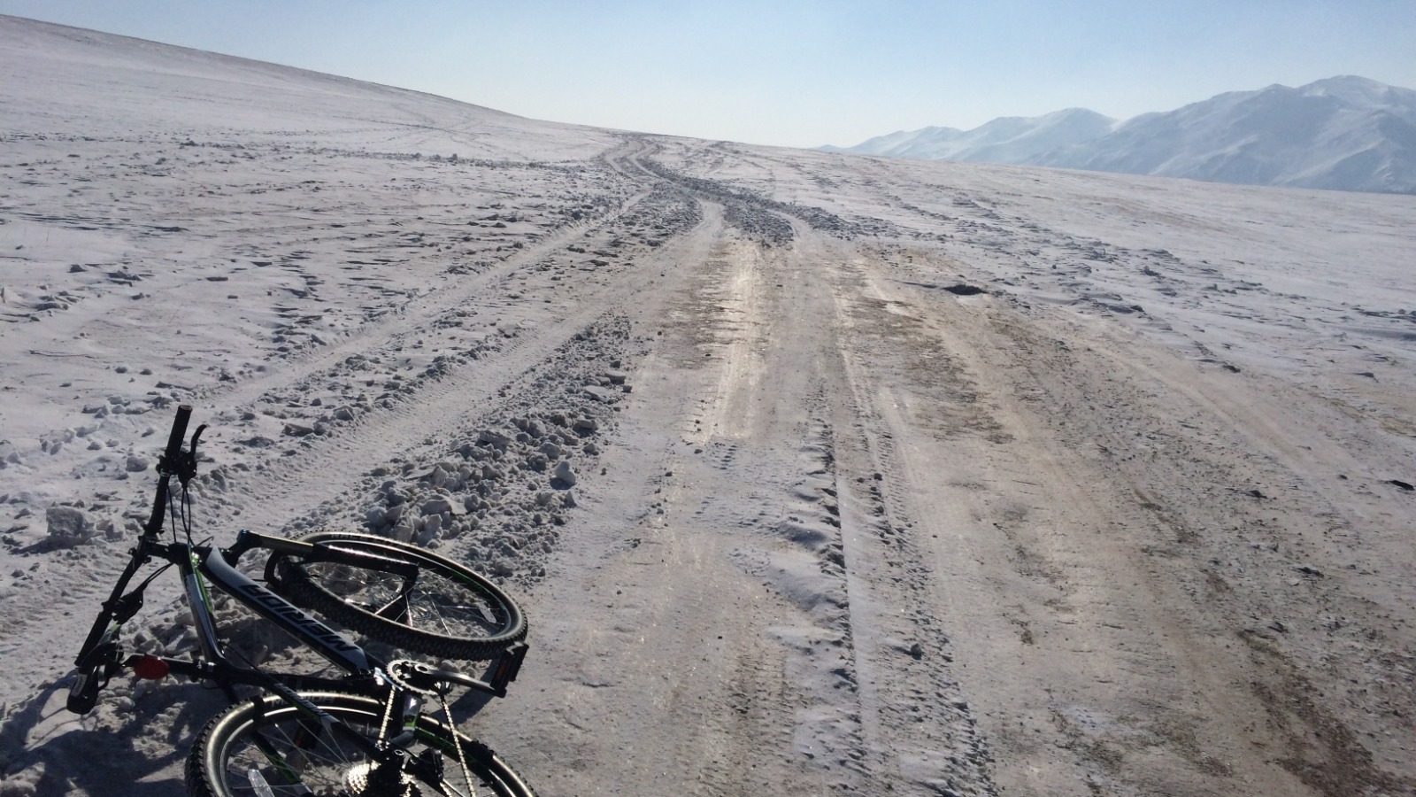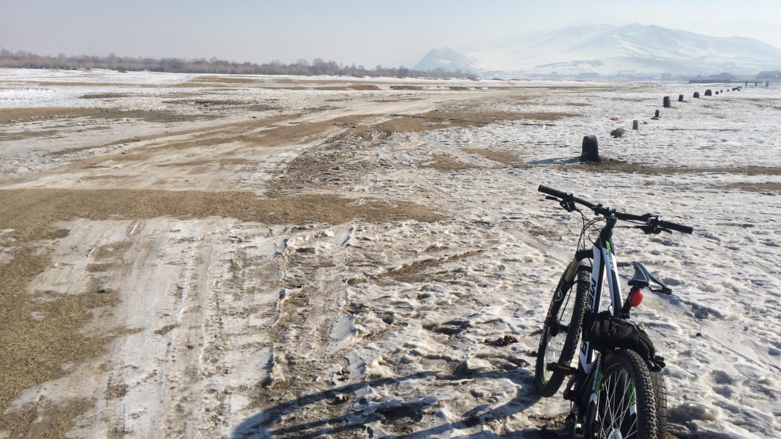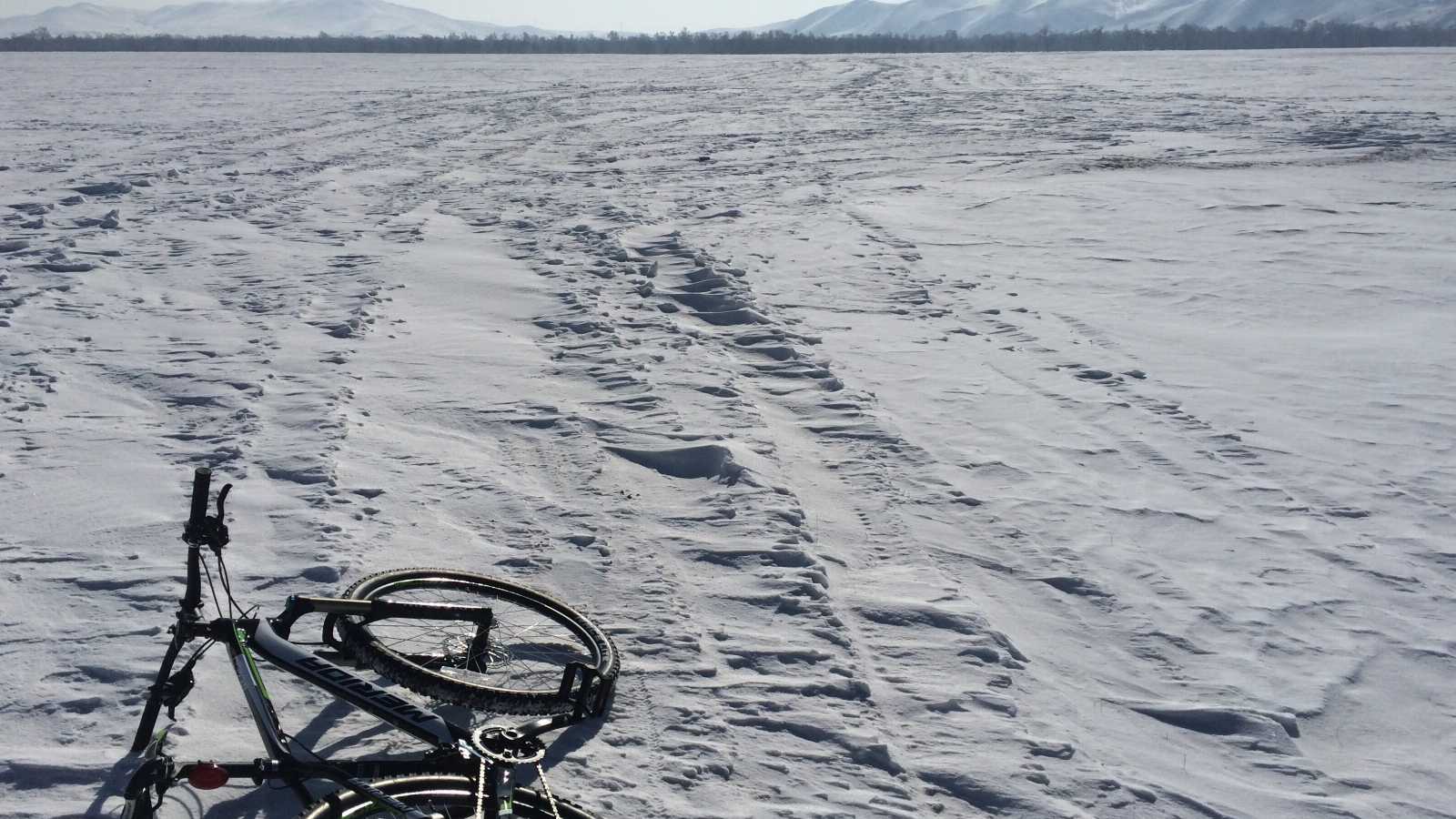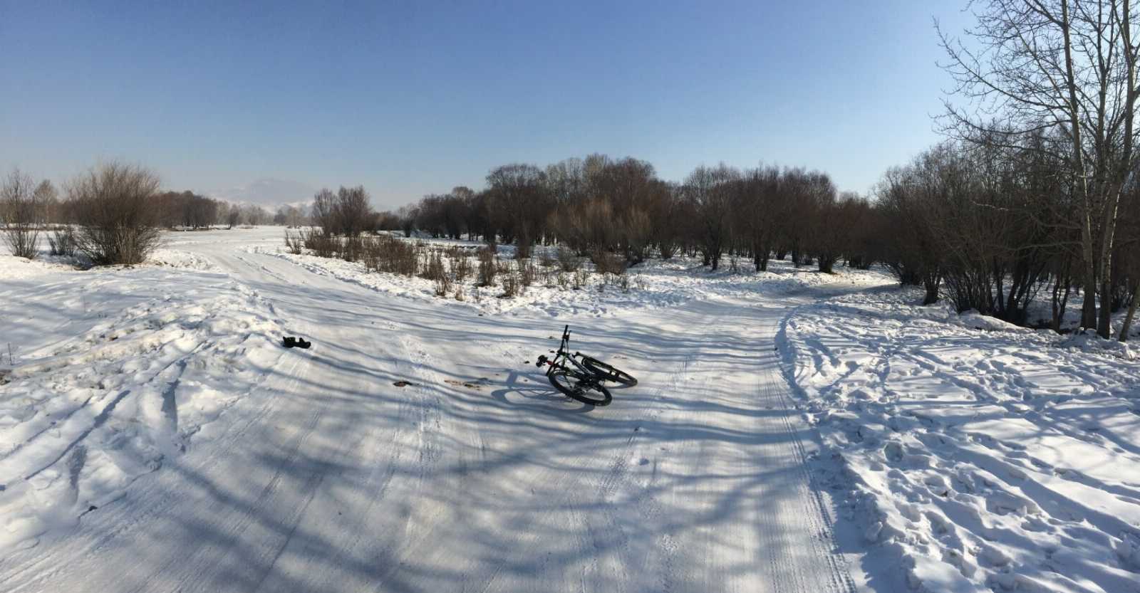 Зураг 4. Явах чигийг зорьсон зам цасанд дарагдсан байлааЖийх боломжгүй болсон тул дугуйгаа түрэн алхсаар Туул голоо гарч цаад дэнж дээр гаран дугуйндаа мордон жийлээ. Налайх дүүрэг дээр ирж ундалж, хооллоод УБ хотын зүг нийтийн тээврийн унаагаар явсан юм.