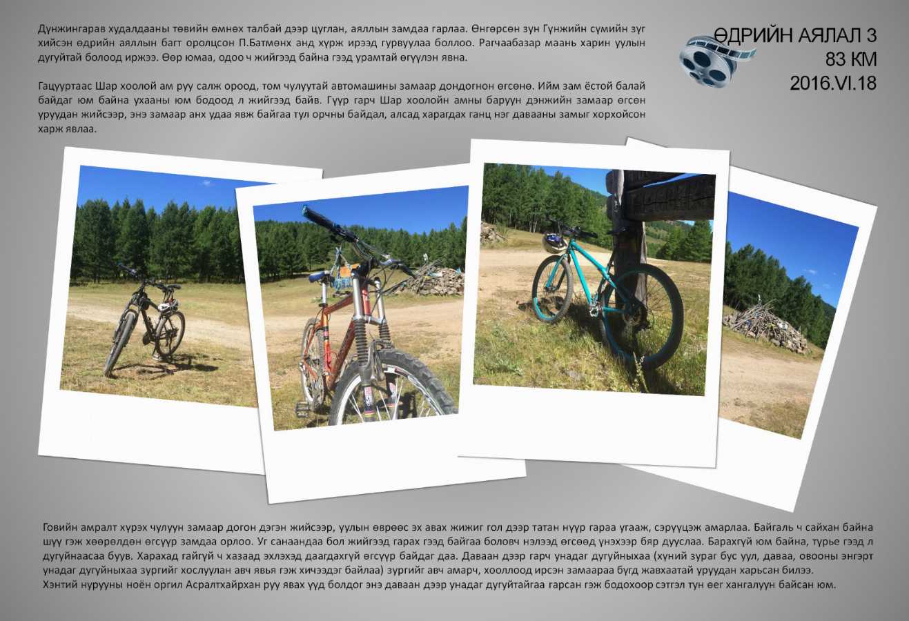 Говийн амралт хүрэх чулуун замаар догон дэгэн жийсээр, уулын өврөөс эх авах жижиг гол дээр татан нүүр гараа угааж, сэрүүцэж амарлаа. Байгаль ч сайхан байна шүү гэж хөөрөлдөн өгсүүр замдаа орлоо. Уг санаандаа бол жийгээд гарах гээд байгаа боловч нэлээд өгсөөд үнэхээр бяр дууслаа. Барахгүй юм байна, түрье гээд л дугуйнаасаа буув. Харахад гайгүй ч хазаад эхлэхэд даагдахгүй өгсүүр байдаг даа. Даваан дээр гарч унадаг дугуйныхаа (хүний зураг бус уул, даваа, овооны энгэрт унадаг дугуйныхаа зургийг хослуулан авч явья гэж хичээдэг байлаа) зургийг авч амарч, хооллоод ирсэн замаараа бүгд жавхаатай уруудан харьсан билээ.