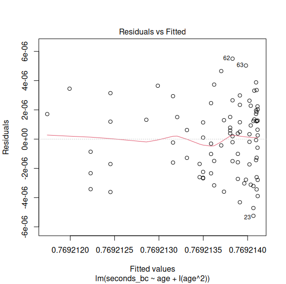 lm(formula = seconds_bc ~ age + I(age^2), data = race)